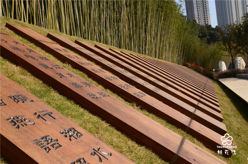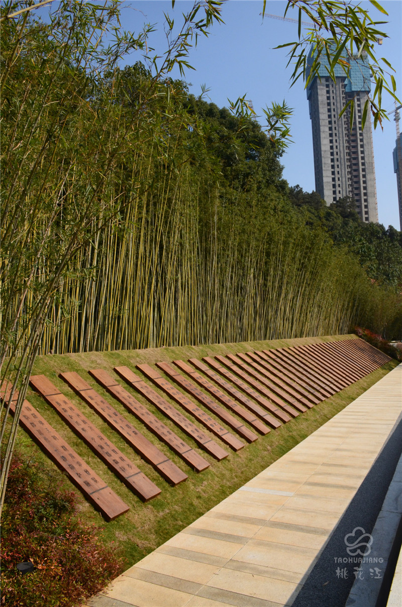 湘江詩廊位于長沙開福區(qū)金霞組團(tuán)鵝羊山公園,臨湘江北路段,總面積約6000平方米。湘江詩廊種植了大面積的景觀竹,清新自然又別具一格,雕刻詩集的板材均來自于湖南桃花江竹材科技股份有限公司生產(chǎn)的高炭防腐戶外竹材。戶外竹材自然環(huán)保,色澤古樸,性能穩(wěn)定,將詩集刻在竹板上,更加彰顯出歷史文化的厚重感和湖湘文化精神面貌。新鮮翠綠的景觀竹和加工后的重組竹板還有精心雕刻的詩集三者渾然一體,體現(xiàn)了自然山水與人文精神的融合。