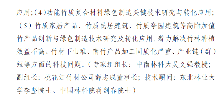 在南竹產(chǎn)業(yè)研究方面,湖南桃花江竹材科技股份有限公司作為南竹行業(yè)的龍頭企業(yè),將和中南林科大,省林科院和湖南大學(xué)等單位組建成湖南省竹產(chǎn)業(yè)技術(shù)創(chuàng)新戰(zhàn)略聯(lián)盟開(kāi)展研究工作。桃花江竹材有限公司的董事長(zhǎng)薛志成做為專家組副組長(zhǎng)和中南林科大、東北林業(yè)大學(xué)、中國(guó)林科院的教授和院士們一起參與項(xiàng)目的研究,為湖南省的千億產(chǎn)業(yè)項(xiàng)目貢獻(xiàn)力量。
