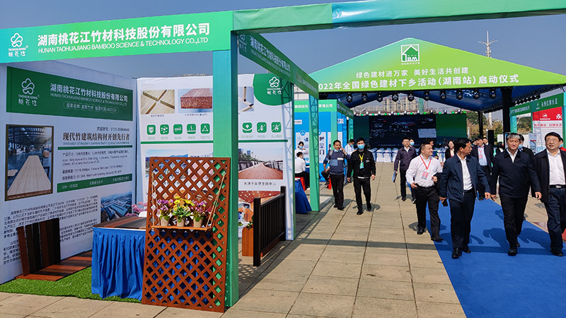 11月1日上午,以“綠色建材進萬家,美好生活共創(chuàng)建”為主題的2022年全國綠色建材下鄉(xiāng)活動(湖南站)啟動儀式在岳陽湘陰縣舉行。工業(yè)和信息化部原材料工業(yè)司副司長邢濤,省工信廳廳長雷紹業(yè)等出席開幕式。湖南桃花江竹材科技股份有限公司作為湖南省綠色竹質(zhì)材料代表受邀參加此次活動。