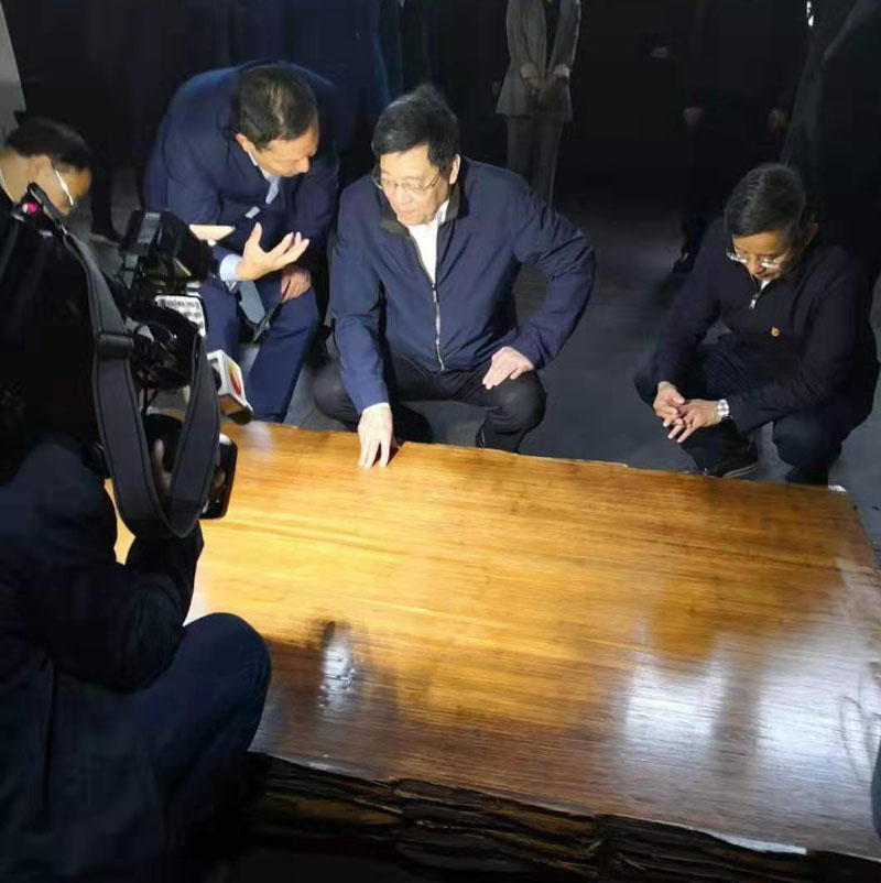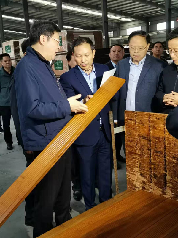 2019年10月15日,湖南省省委書記、省人大常委會主任杜家毫一行蒞臨我司考察調(diào)研,這也是他任職湖南省后第二次造訪桃花江竹材。湖南省委常委、湖南省委秘書長張劍飛,益陽市市委書記瞿海、益陽市市長張值恒等相關(guān)部門領(lǐng)導(dǎo)陪同調(diào)研。在公司董事長薛志成的陪同下,杜書記一行深入我司戶外竹材生產(chǎn)車間一線調(diào)研,對我司生產(chǎn)經(jīng)營、人才培養(yǎng)、科技創(chuàng)新和新產(chǎn)品開發(fā)等方面進行了調(diào)研。杜書記仔細端詳公司產(chǎn)品,詳細詢問產(chǎn)品的生產(chǎn)流程,應(yīng)用領(lǐng)域和銷售情況,他對公司擁有戶外防腐竹材、竹地板、竹墻板等10余項國家授權(quán)發(fā)明專利的研發(fā)能力表示贊賞,他說 :"我們需要的就是像桃花江竹材這樣的企業(yè) ,有較強的自主研發(fā)能力,生產(chǎn)的戶外竹材產(chǎn)品,環(huán)保又可持續(xù)發(fā)展,市場前景巨大,發(fā)展竹產(chǎn)業(yè)又能帶動周邊竹農(nóng)致富,政府表示大力支持,前不久出臺的那個湖南農(nóng)業(yè)優(yōu)勢特色千億產(chǎn)業(yè)行動方案就部署了對楠竹產(chǎn)業(yè)的發(fā)展規(guī)劃,希望桃花江竹材作為竹產(chǎn)業(yè)的龍頭企業(yè),能充分發(fā)揮引領(lǐng)帶頭作用,提升竹產(chǎn)業(yè)的科技創(chuàng)新能力,為把竹產(chǎn)業(yè)做大做強貢獻更大的力量。"