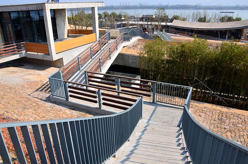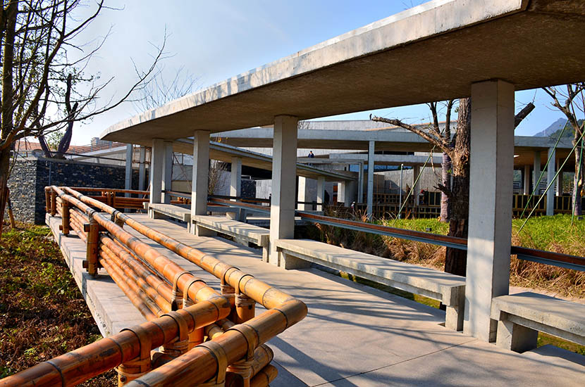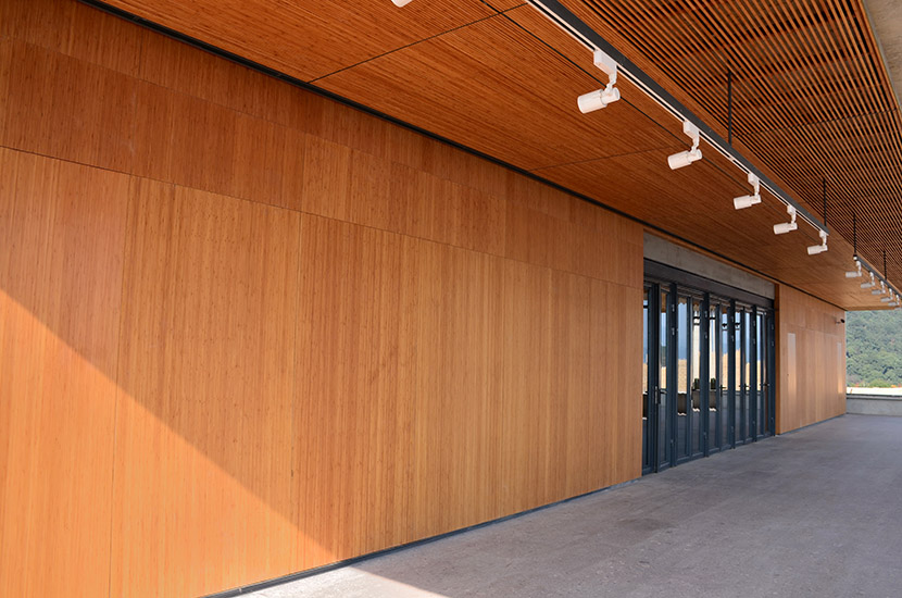 富陽公望美術(shù)館也叫富春山館, 位于杭州市富陽區(qū), 是集博物館、美術(shù)館、檔案館 三館合一的建筑綜合體, 由著名設計大師 王澍設計。 大師以蘇東坡《題西林壁》里的描繪 為靈感來源, 按照中國傳統(tǒng)的山水序列, 建筑整體構(gòu)筑中呈現(xiàn)近山、 遠山瀠洄呼應的構(gòu)筑法則和三遠視角, 與咫尺之遙的富春山水互相輝映。 美術(shù)館設計成內(nèi)山和外山, 站在屋頂會看到一整片美術(shù)館都是外山, 而頂上兩件小居, 正是設計師心中的富春山居。 美術(shù)館大量運用桃花江戶外防腐竹材 和室內(nèi)裝飾竹材, 是典型的竹元素主題建筑, 在文化場所的建設中 竹材 是設計師表達設計文化內(nèi)涵的有力工具。