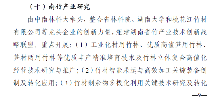 在南竹產(chǎn)業(yè)研究方面,湖南桃花江竹材科技股份有限公司作為南竹行業(yè)的龍頭企業(yè),將和中南林科大,省林科院和湖南大學(xué)等單位組建成湖南省竹產(chǎn)業(yè)技術(shù)創(chuàng)新戰(zhàn)略聯(lián)盟開展研究工作。桃花江竹材有限公司的董事長薛志成做為專家組副組長和中南林科大、東北林業(yè)大學(xué)、中國林科院的教授和院士們一起參與項目的研究,為湖南省的千億產(chǎn)業(yè)項目貢獻(xiàn)力量。